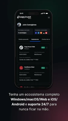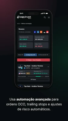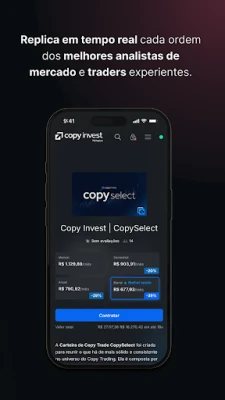 - Segue e replica automaticamente as operações dos melhores traders e analistas de mercado.