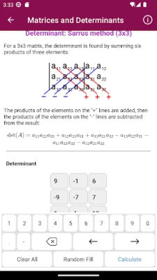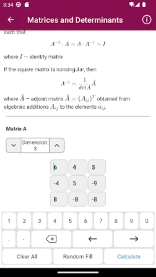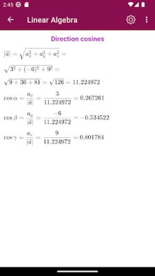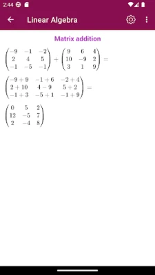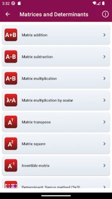 Perform step-by-step calculations with clear, detailed solutions. The app supports matrices up to 5x5 and 2D/3D vectors, with each calculator including a quick theoretical explanation to deepen your understanding.