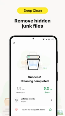 ◦ Deep clean to free up more space: Remove hidden junk files to regain storage space for what matters to you.