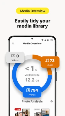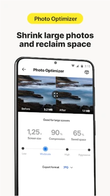 ◦ Find and delete unwanted, bad, duplicate, or similar photos, images, screenshots, and large videos. If your photos are too precious to remove, compress them