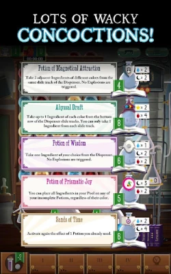 At the beginning of the game, each player is given potions to complete with specific effects and ingredients. You will have to select ingredients in the dispenser; once your selected ingredient is removed, the ingredients above will slide down. If two ingredients of the same nature collide, they explode and you get them too! You can then use your ingredients to cook up your potions. You only have a limited tank space to store remaining ingredients from one turn to another, so choose carefully! Once a potion is completed, you score points, get to use its powerful effect and pick another potion to craft. The wizard with the most points wins!