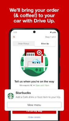 Drive Up, an exclusive offering only in the Target app, lets you stay in the comfort of your car while we bring your order (and your Starbucks coffee!) right to you. Have returns? No problem! You can process your items from the app and we’ll take grab them for you too.