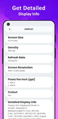 This feature provides Screen Size, Screen Density, Screen Refresh Rate, Frame Per Seconds (fps), Screen Resolution, Pixels per Inch (ppi), Density Independent Pixels (dpi) and etc.