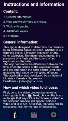 "Where Is Explosion?" - is an application designed to determine the distance to an explosion based on video, whether it is a lightning strike, a firework explosion or any other explosion. The main requirements: the presence of a flash and the sound of an explosion on the video.